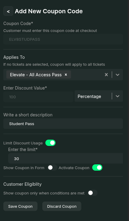 DISCOUNT50,EARLYBIRD25). - Select the tickets to which this coupon applies from the dropdown.