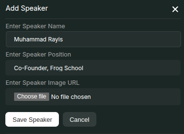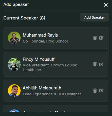 - Similar to venue management, speaker details (name, position, image) can be edited or removed using the respective buttons next to each speaker.