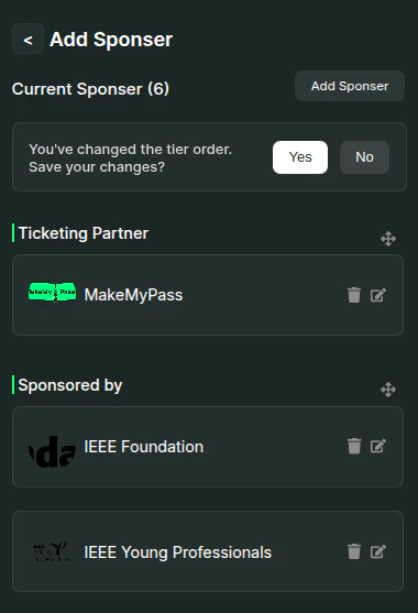 - You can edit or delete a sponsor by using the respective Edit and Delete icons next to each sponsor in the listing section.