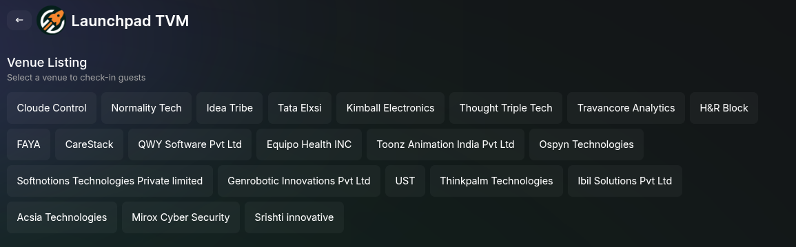 - Clicking it will list the set of venues added to the event. Select the venue you want to check in.