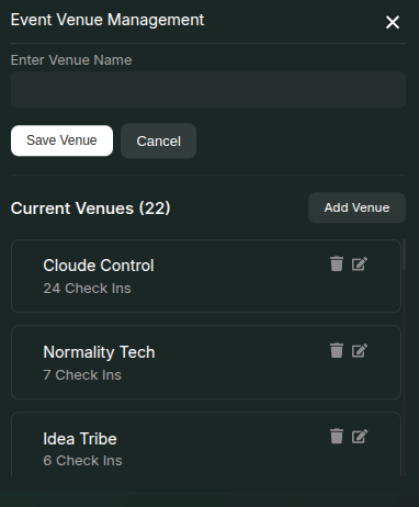 - Once listed, you can edit or delete a venue by clicking the respective buttons next to it.